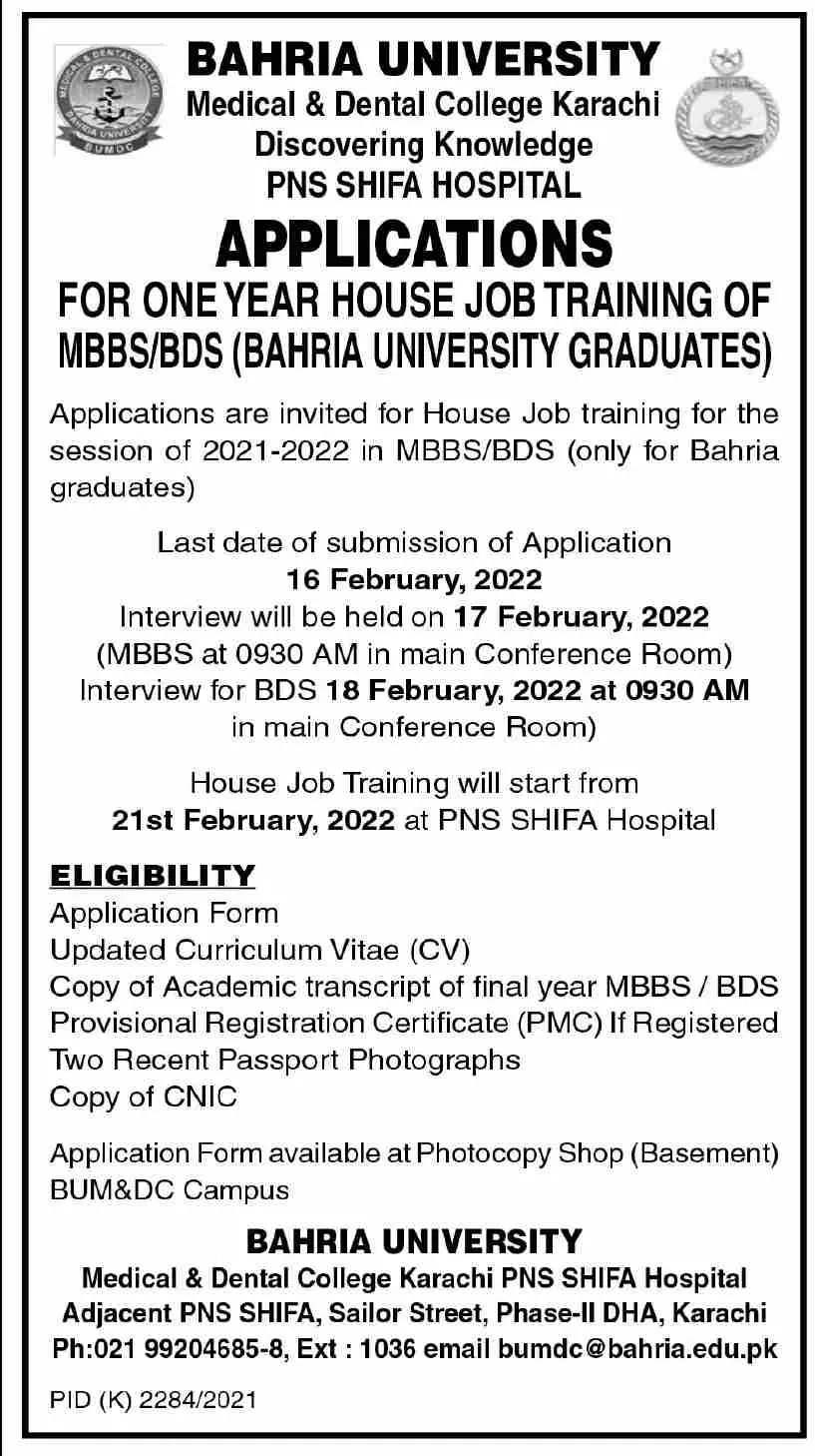 Bahria University Medical & Dental College karachi JOBS announce the Contract career opportunities for the post of See Below Ad in Karachi for the fresh and experienced candidates on Contract basis who have Check Advertisement degree. Posted date of this post is 14/02/2022 and the last date is 21/02/2022. if you are eligible for this job apply before due date.