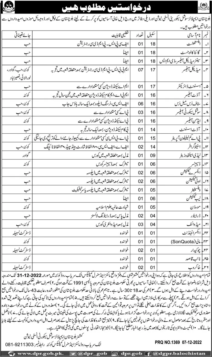 Balochistan Employees Social Security Institution Jobs 2022 announce the Contract career opportunities for the post of See Below Ad in Balochistan, Quetta for the fresh and experienced candidates on Contract basis who have Check Advertisement degree. Posted date of this post is 08/12/2022 and the last date is 31/12/2022. if you are eligible for this job apply before due date.
