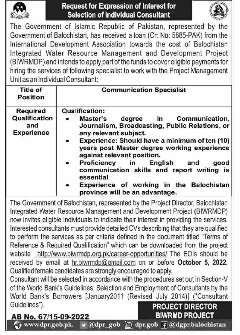 Balochistan Integrated Water Resources Management Jobs announce the Contract career opportunities for the post of See Below Ad in Balochistan for the fresh and experienced candidates on Contract basis who have Check Advertisement degree. Posted date of this post is 16/09/2022 and the last date is 05/10/2022. if you are eligible for this job apply before due date.