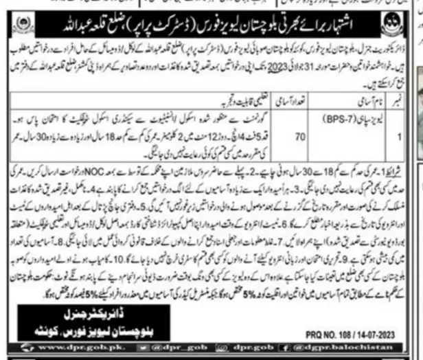 Balochistan Levies Force District Proper Jobs 2023 announce the Contract career opportunities for the post of See Below Ad in Balochistan, Killa Abdullah for the fresh and experienced candidates on Contract basis who have Check Advertisement degree. Posted date of this post is 15/07/2023 and the last date is 31/07/2023. if you are eligible for this job apply before due date.