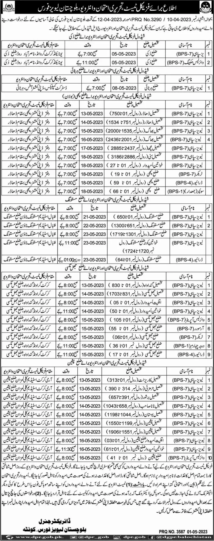Balochistan Levis Force Physical Test Interview 2023 announce the Contract career opportunities for the post of See Below Ad in Balochistan, Quetta for the fresh and experienced candidates on Contract basis who have Check Advertisement degree. Posted date of this post is 02/05/2023 and the last date is 16/06/2023. if you are eligible for this job apply before due date.