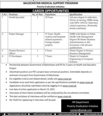 Balochistan Medical Support Program Jobs 2022 announce the Contract career opportunities for the post of See Below Ad in Balochistan, Quetta for the fresh and experienced candidates on Contract basis who have Check Advertisement degree. Posted date of this post is 12/03/2022 and the last date is 23/03/2022. if you are eligible for this job apply before due date.