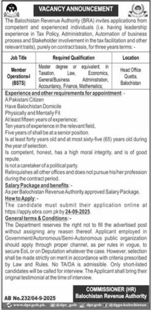 The Balochistan Revenue Authority (BRA) invites applications from competent and experienced individuals (i.e. having leadership experience in Tax Policy, Administration, Automation of business process and Stakeholder involvement in the tax facilitation and other relevant traits), purely on contract basis, for three years terms:-