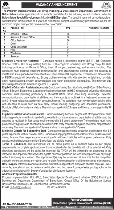 The Program Implementation Unit (PIU), Planning & Development Department, Government of Balochistan, invites applications from suitable candidates for the following vacant positions under the Balochistan Special Development Initiative (BSDI) project. The appointments will be made purely on contract basis for the period of 1 year and extendable, subject to satisfactory performance, as per the approved Project Policy of the Government of Balochistan.