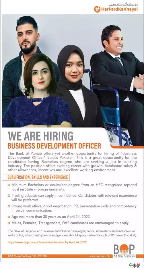 Bank of Punjab BOP Jobs 2022 announce the Contract career opportunities for the post of See Below Ad in Punjab for the fresh and experienced candidates on Contract basis who have Check Advertisement degree. Posted date of this post is 11/04/2022 and the last date is 24/04/2022. if you are eligible for this job apply before due date.
