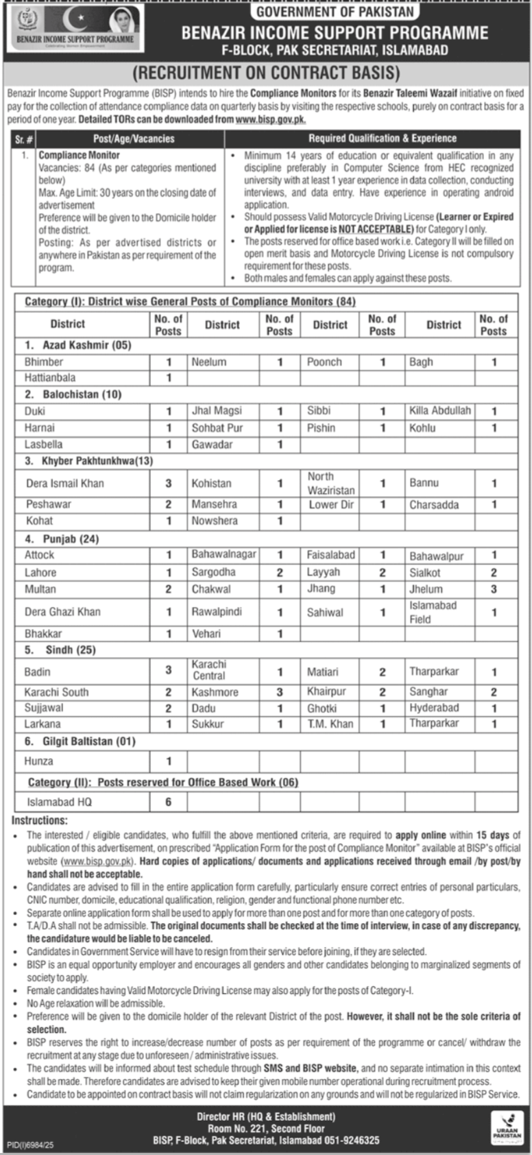 Benazir Income Support Programme BISP Islamabad Job 2026 announce the Contract career opportunities for the post of See Below Ad in Federal, Islamabad for the fresh and experienced candidates on Contract basis who have Check Advertisement degree. Posted date of this post is 26/02/2026 and the last date is 13/03/2026. if you are eligible for this job apply before due date.