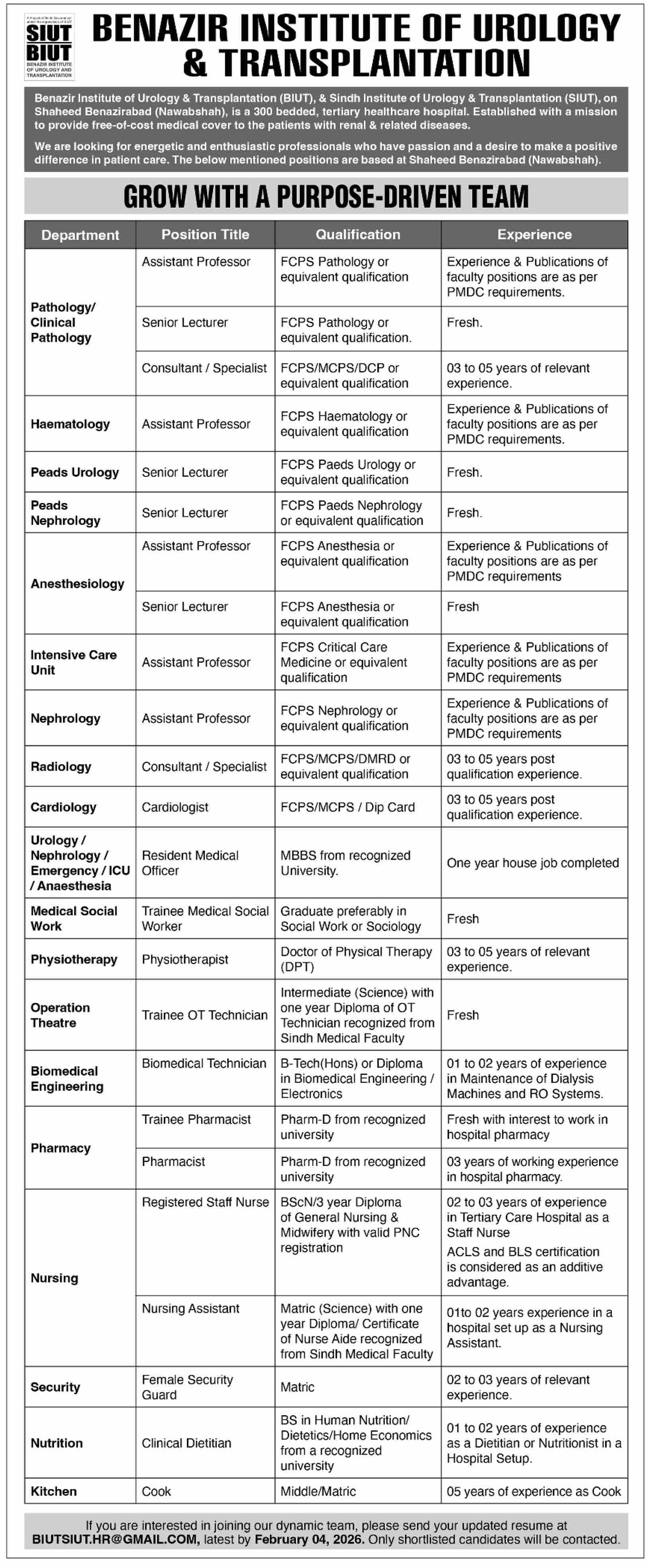 Benazir Institute Of Urology Sndh Jobs 2026 announce the Contract career opportunities for the post of See Below Ad in Sindh, Karachi for the fresh and experienced candidates on Contract basis who have Check Advertisement degree. Posted date of this post is 25/01/2026 and the last date is 04/02/2026. if you are eligible for this job apply before due date.