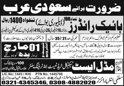 - Middle East Technical Trade Test & Training Center Jeddah, makkah Saudi Arabia invites applications from eligible candidates for the post of rider and bike rider as per advertisement of February 26, 2023 published in daily Express Newspaper. Candidates with Matric etc.