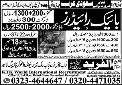 Bike Rider Jobs 2023 In Saudi Arabia KSA announce the Contract career opportunities for the post of See Below Ad in Saudi Arabia for the fresh and experienced candidates on Contract basis who have Check Advertisement degree. Posted date of this post is 17/09/2023 and the last date is 18/09/2023. if you are eligible for this job apply before due date.