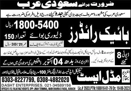 Bike Rider Jobs 2023 In Saudi Arabia KSA announce the Contract career opportunities for the post of See Below Ad in Saudi Arabia for the fresh and experienced candidates on Contract basis who have Check Advertisement degree. Posted date of this post is 01/10/2023 and the last date is 04/10/2023. if you are eligible for this job apply before due date.