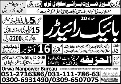 Bike Rider Jobs 2023 In Saudi Arabia KSA announce the Contract career opportunities for the post of See Below Ad in Saudi Arabia for the fresh and experienced candidates on Contract basis who have Check Advertisement degree. Posted date of this post is 15/10/2023 and the last date is 16/10/2023. if you are eligible for this job apply before due date.