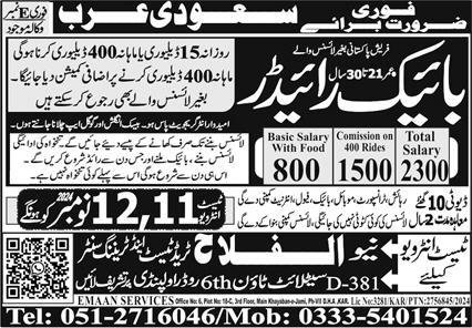 Bike Rider Jobs Career Opportunity In Saudi Arabia 2024 announce the Contract career opportunities for the post of See Below Ad in Saudi Arabia for the fresh and experienced candidates on Contract basis who have Check Advertisement degree. Posted date of this post is 31/10/2024 and the last date is 12/11/2024. if you are eligible for this job apply before due date.
