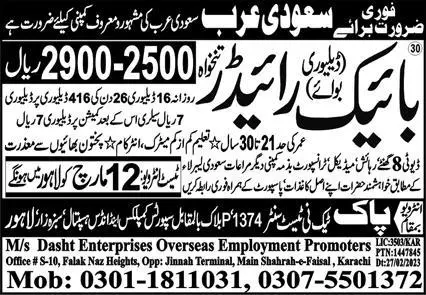 Bike Rider Jobs in Saudi Arabia 2023 announce the Contract career opportunities for the post of See Below Ad in Saudi Arabia for the fresh and experienced candidates on Contract basis who have Check Advertisement degree. Posted date of this post is 09/03/2023 and the last date is 12/03/2023. if you are eligible for this job apply before due date.