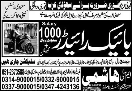 Bike Rider Jobs In Saudia Arabia 2023 announce the Contract career opportunities for the post of See Below Ad in Saudi Arabia for the fresh and experienced candidates on Contract basis who have Check Advertisement degree. Posted date of this post is 26/05/2023 and the last date is 26/06/2023. if you are eligible for this job apply before due date.