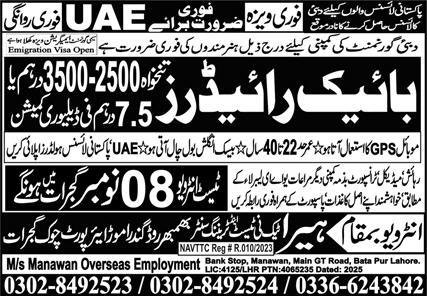 Bike Rider Jobs in United Arab Emerities 2025 announce the Contract career opportunities for the post of See Below Ad in United Arab Emirates for the fresh and experienced candidates on Contract basis who have Check Advertisement degree. Posted date of this post is 04/11/2025 and the last date is 08/11/2025. if you are eligible for this job apply before due date.
