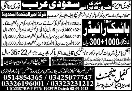 Bike Rider & Rider Jobs 2023 In Saudi Arabia announce the Contract career opportunities for the post of See Below Ad in Saudi Arabia for the fresh and experienced candidates on Contract basis who have Check Advertisement degree. Posted date of this post is 13/09/2023 and the last date is 20/09/2023. if you are eligible for this job apply before due date.
