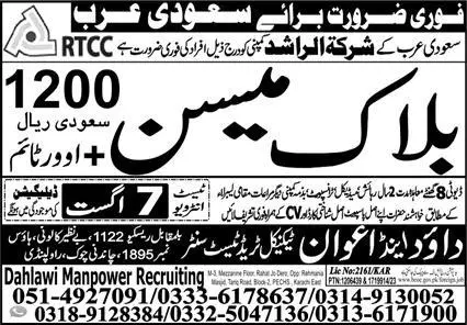 Block Mason Jobs In Saudi Arabia 2023 announce the Contract career opportunities for the post of See Below Ad in Saudi Arabia for the fresh and experienced candidates on Contract basis who have Check Advertisement degree. Posted date of this post is 04/08/2023 and the last date is 07/08/2023. if you are eligible for this job apply before due date.