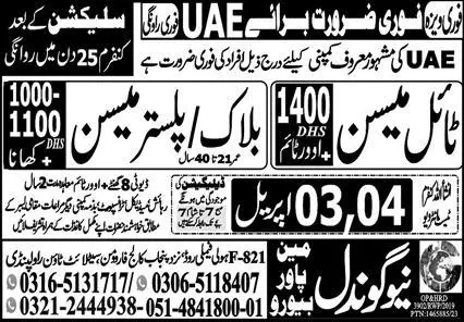 Block Mason & Plaster Mason Jobs 2023 in UAE announce the Contract career opportunities for the post of See Below Ad in United Arab Emirates for the fresh and experienced candidates on Contract basis who have Check Advertisement degree. Posted date of this post is 01/04/2023 and the last date is 04/04/2023. if you are eligible for this job apply before due date.