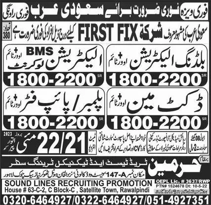 BMS Electrician Low Current & Pipe Fitter Jobs 2023 announce the Contract career opportunities for the post of See Below Ad in Saudi Arabia for the fresh and experienced candidates on Contract basis who have Check Advertisement degree. Posted date of this post is 16/05/2023 and the last date is 22/05/2023. if you are eligible for this job apply before due date.