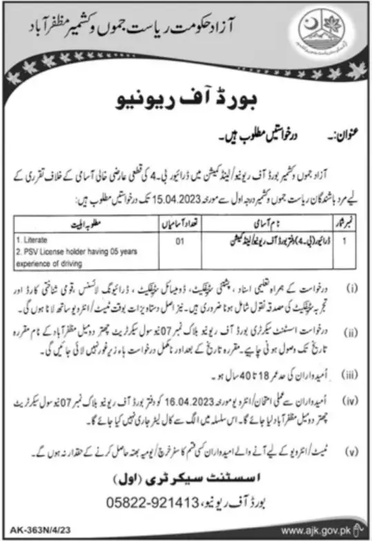 Board of Revenue Azad Jammu Kashmir Jobs 2023 announce the Contract career opportunities for the post of See Below Ad in Azad Jammu Kashmir, Muzaffarabad for the fresh and experienced candidates on Contract basis who have Check Advertisement degree. Posted date of this post is 07/04/2023 and the last date is 15/04/2023. if you are eligible for this job apply before due date.