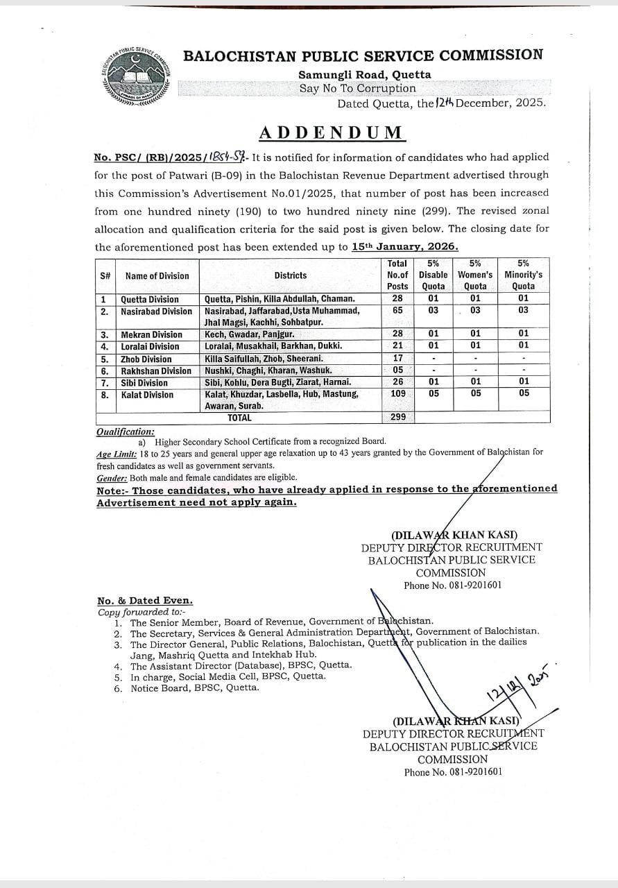 BPSC Patwari Jobs 2026 – Advertisement No 1-2025 announce the Permanent career opportunities for the post of See Below Ad in Balochistan, Quetta for the fresh and experienced candidates on Permanent basis who have Check Advertisement degree. Posted date of this post is 12/12/2025 and the last date is 15/01/2026. if you are eligible for this job apply before due date.