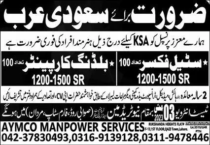 Building Carpenter & Steel Fixer Jobs 2023 In Saudi Arabia announce the Contract career opportunities for the post of See Below Ad in Saudi Arabia for the fresh and experienced candidates on Contract basis who have Check Advertisement degree. Posted date of this post is 29/04/2023 and the last date is 03/05/2023. if you are eligible for this job apply before due date.