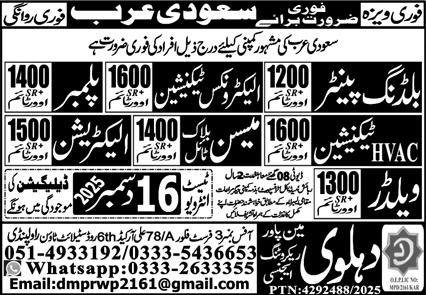 Building Painter And Plumber Jobs in Saudia Arabia 2025 announce the Contract career opportunities for the post of See Below Ad in Saudi Arabia for the fresh and experienced candidates on Contract basis who have Check Advertisement degree. Posted date of this post is 11/12/2025 and the last date is 16/12/2025. if you are eligible for this job apply before due date.
