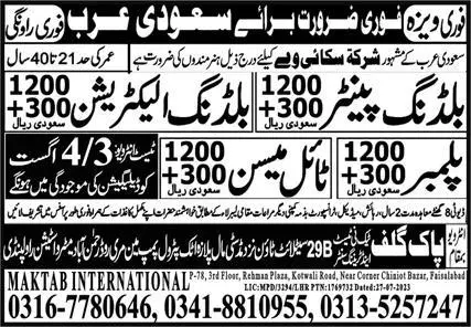 Building Painter & Plumber Saudi Arabia 2023 announce the Contract career opportunities for the post of See Below Ad in Saudi Arabia for the fresh and experienced candidates on Contract basis who have Check Advertisement degree. Posted date of this post is 01/08/2023 and the last date is 04/08/2023. if you are eligible for this job apply before due date.