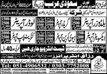 Buldizor Operator And Loader Operator Jobs in Saudia Arabia announce the Contract career opportunities for the post of See Below Ad in Saudi Arabia for the fresh and experienced candidates on Contract basis who have Check Advertisement degree. Posted date of this post is 18/09/2025 and the last date is 26/09/2025. if you are eligible for this job apply before due date.