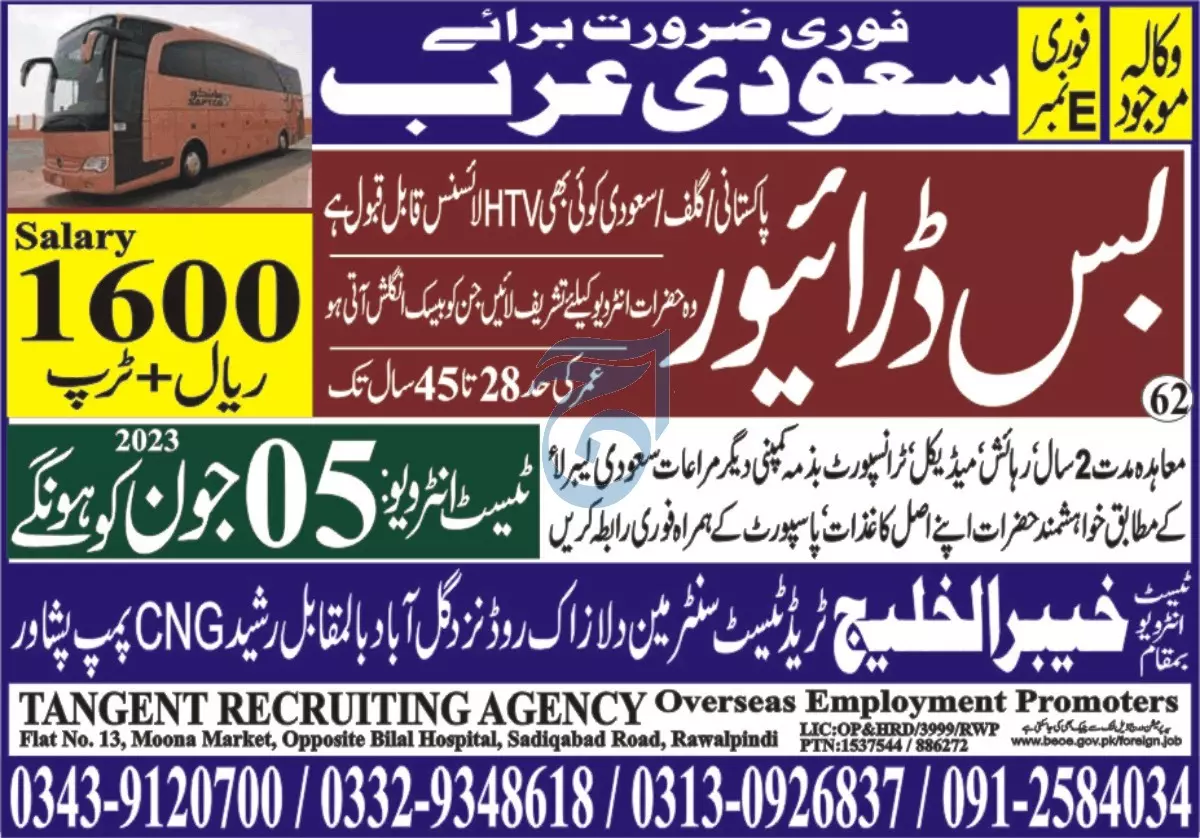 Bus driver Jobs in Saudi Arabia 2023 announce the Contract career opportunities for the post of See Below Ad in Saudi Arabia for the fresh and experienced candidates on Contract basis who have Check Advertisement degree. Posted date of this post is 03/06/2023 and the last date is 05/06/2023. if you are eligible for this job apply before due date.