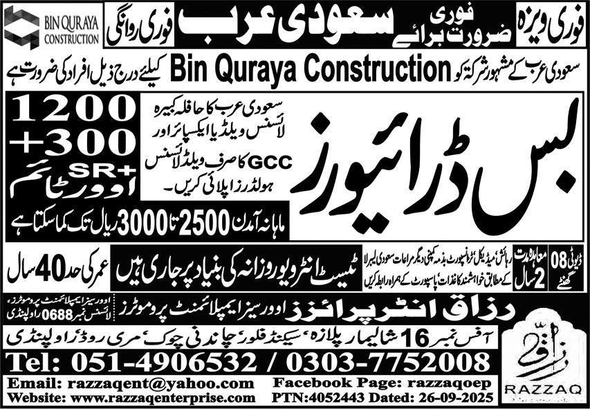 Bus Driver Jobs in Saudia Arabia 2025 announce the Contract career opportunities for the post of See Below Ad in Saudi Arabia for the fresh and experienced candidates on Contract basis who have Check Advertisement degree. Posted date of this post is 30/10/2025 and the last date is 08/11/2025. if you are eligible for this job apply before due date.