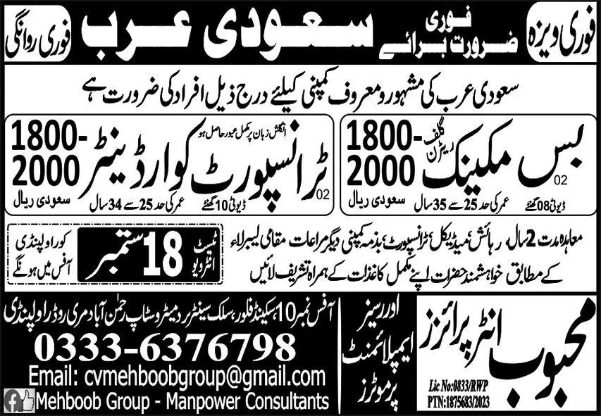 Bus Mechanic & Transport Coordinator Jobs 2023 Saudi Arabia announce the Contract career opportunities for the post of See Below Ad in Saudi Arabia for the fresh and experienced candidates on Contract basis who have Check Advertisement degree. Posted date of this post is 14/09/2023 and the last date is 18/09/2023. if you are eligible for this job apply before due date.