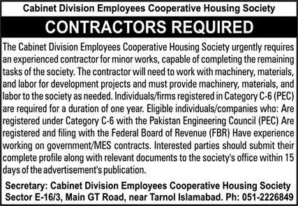 The Cabinet Division Employees Cooperative Housing Society urgently requires an experienced contractor for minor works, capable of completing the remaining tasks of the society. The contractor will need to work with machinery, materials, and labor for development projects and must provide machinery, materials, and labor to the society as needed. Individuals/firms registered in Category C-6 (PEC) are required for a duration of one year. Eligible individuals/companies who: Are registered under Category C-6 with the Pakistan Engineering Council (PEC) Are registered and filing with the Federal Board of Revenue (FBR) Have experience working on government/MES contracts. Interested parties should submit their complete profile along with relevant documents to the society's office within 15 days of the advertisement's publication.