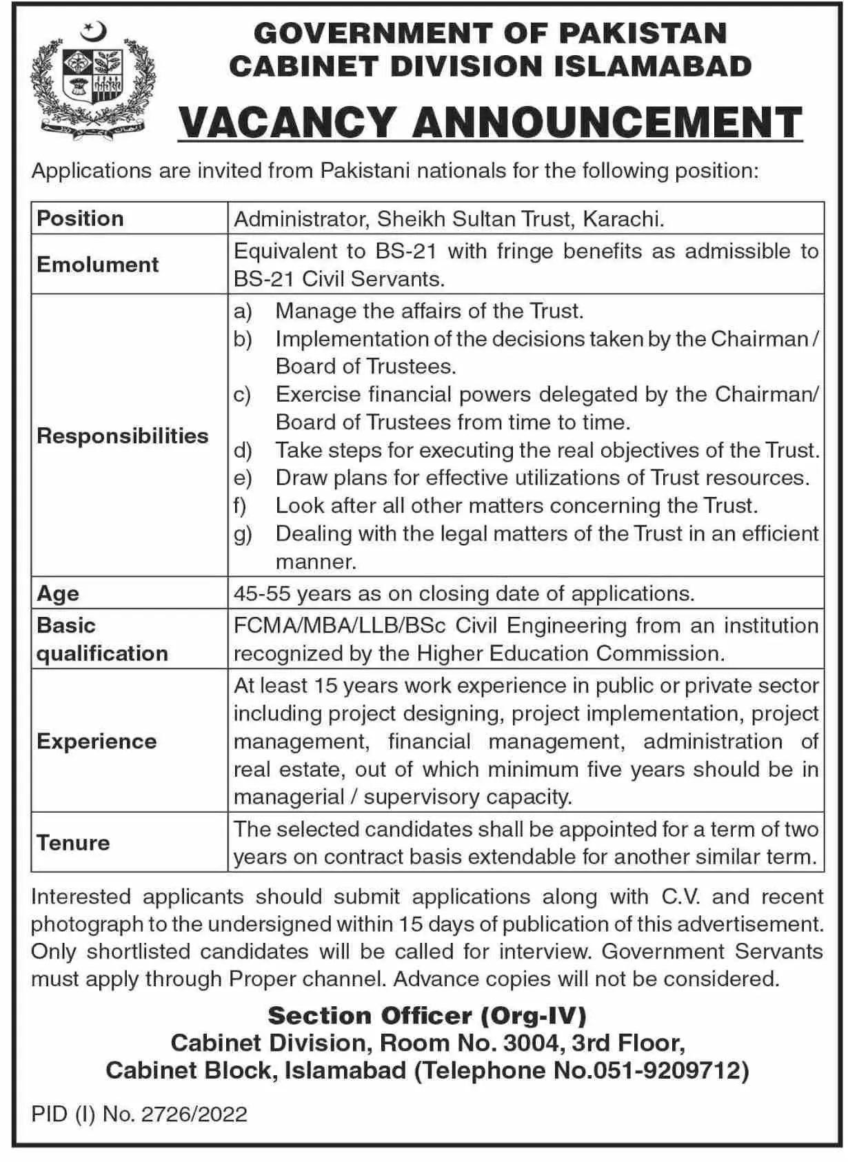Cabinet Division Islamabad Jobs 2022 announce the Contract career opportunities for the post of See Below Ad in Federal, Islamabad for the fresh and experienced candidates on Contract basis who have Check Advertisement degree. Posted date of this post is 29/10/2022 and the last date is 13/11/2022. if you are eligible for this job apply before due date.