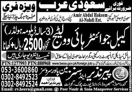Cable Jointer High Voltage Jobs 2023 in Saudi Arabia announce the Contract career opportunities for the post of See Below Ad in Saudi Arabia for the fresh and experienced candidates on Contract basis who have Check Advertisement degree. Posted date of this post is 05/04/2023 and the last date is 12/04/2023. if you are eligible for this job apply before due date.