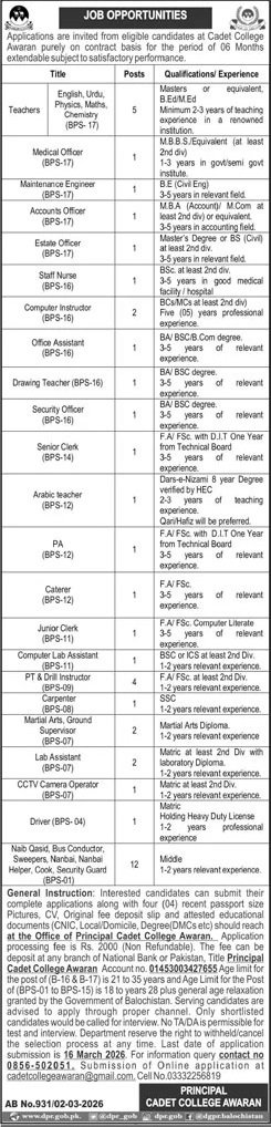 Cadet College Awaran Balohistan Jobs 2026 announce the Contract career opportunities for the post of See Below Ad in Balochistan, Awaran for the fresh and experienced candidates on Contract basis who have Check Advertisement degree. Posted date of this post is 03/03/2026 and the last date is 16/03/2026. if you are eligible for this job apply before due date.
