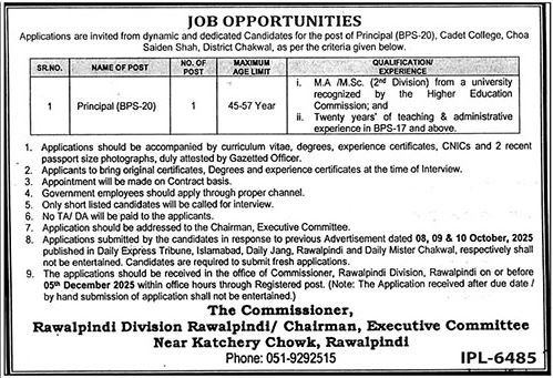 Applications are invited from dynamic and dedicated Candidates for the post of Principal (BPS-20), Cadet College, Choa Saiden Shah, District Chakwal, as per the criteria given below.