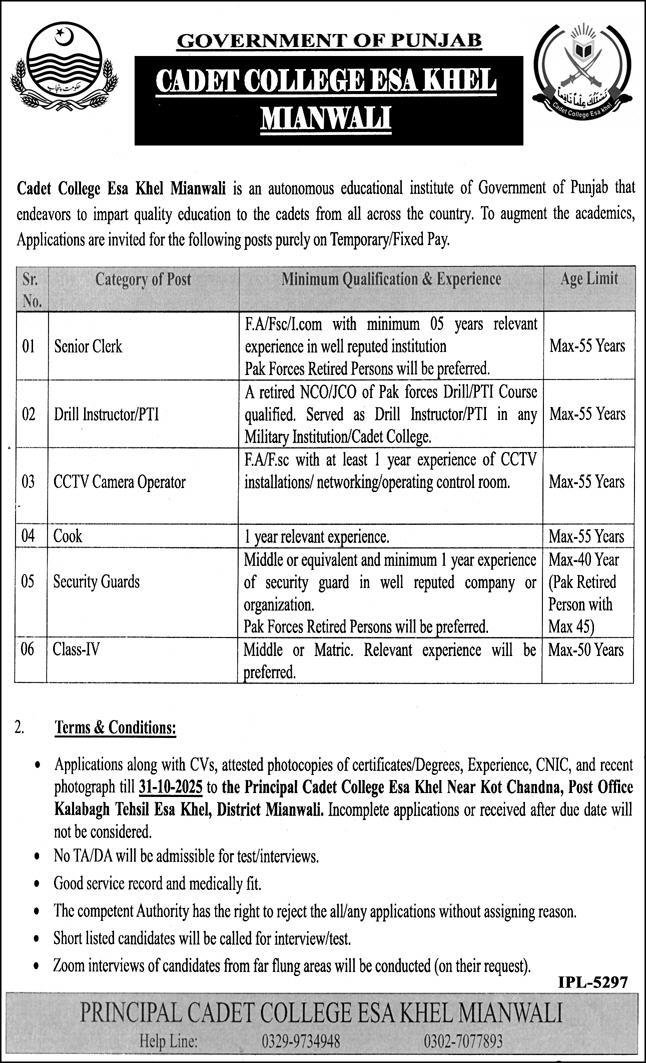 Cadet College Esa Khel CCEK Mianwali Jobs 2025 announce the Contract career opportunities for the post of See Below Ad in Punjab,Mianwali for the fresh and experienced candidates on Contract basis who have Check Advertisement degree. Posted date of this post is 18/10/2025 and the last date is 31/10/2025. if you are eligible for this job apply before due date.