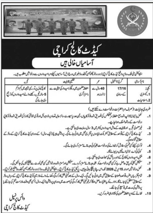 Cadet College Karachi Sindh Jobs 2026 announce the Contract career opportunities for the post of See Below Ad in Sindh, Karachi for the fresh and experienced candidates on Contract basis who have Check Advertisement degree. Posted date of this post is 23/03/2026 and the last date is 15/04/2026. if you are eligible for this job apply before due date.