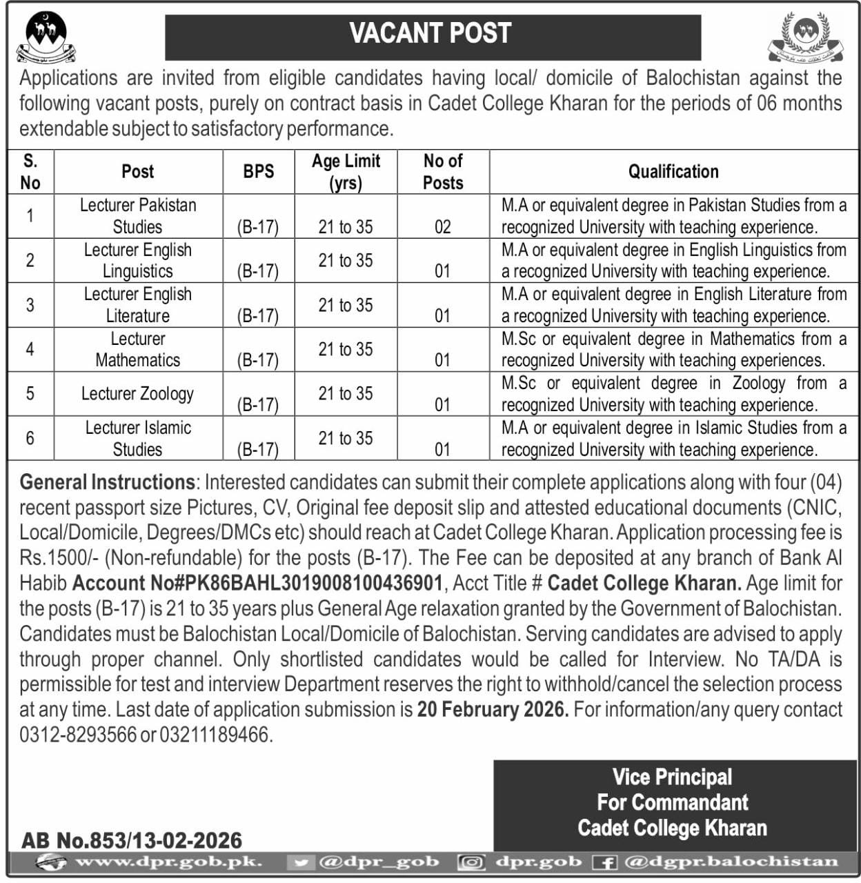 Cadet College Kharan Balochistan Jobs 2026 announce the Contract career opportunities for the post of See Below Ad in Balochistan, Kharan for the fresh and experienced candidates on Contract basis who have Check Advertisement degree. Posted date of this post is 18/02/2026 and the last date is 20/02/2026. if you are eligible for this job apply before due date.