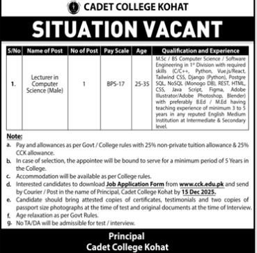 Cadet College kohat Khyber Pakhtunkhwa Jobs 2025 announce the Contract career opportunities for the post of See Below Ad in Khyber Pakhtunkhwa, Kohat for the fresh and experienced candidates on Contract basis who have Check Advertisement degree. Posted date of this post is 23/11/2025 and the last date is 15/12/2025. if you are eligible for this job apply before due date.