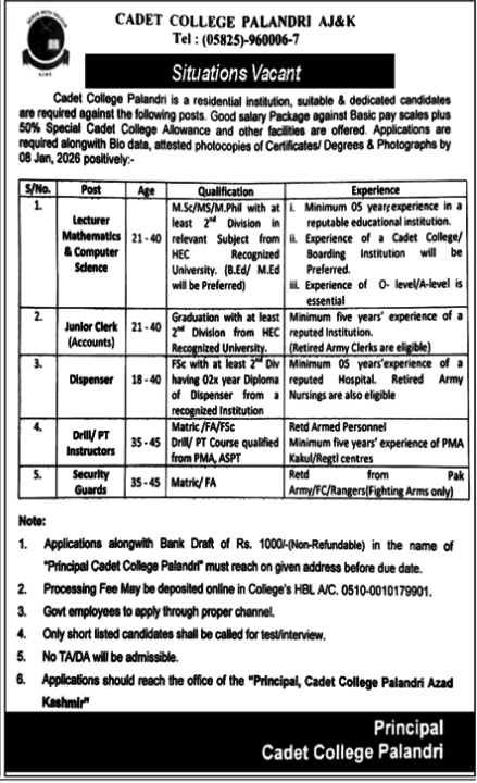 Cadet College Palandri is a residential institution, suitable & dedicated candidates are required against the following posts. Good salary Package against Basic pay scales plus 50% Special Cadet College Allowance and other facilities are offered. Applications are required alongwith Bio data, attested photocopies of Certificates/ Degrees & Photographs by 08 Jan, 2026 positively:-