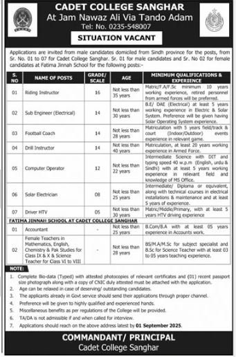 Cadet College Sanghar Sindh Jobs 2025 announce the Contract career opportunities for the post of See Below Ad in Sindh, Sanghar for the fresh and experienced candidates on Contract basis who have Check Advertisement degree. Posted date of this post is 24/08/2025 and the last date is 01/09/2025. if you are eligible for this job apply before due date.