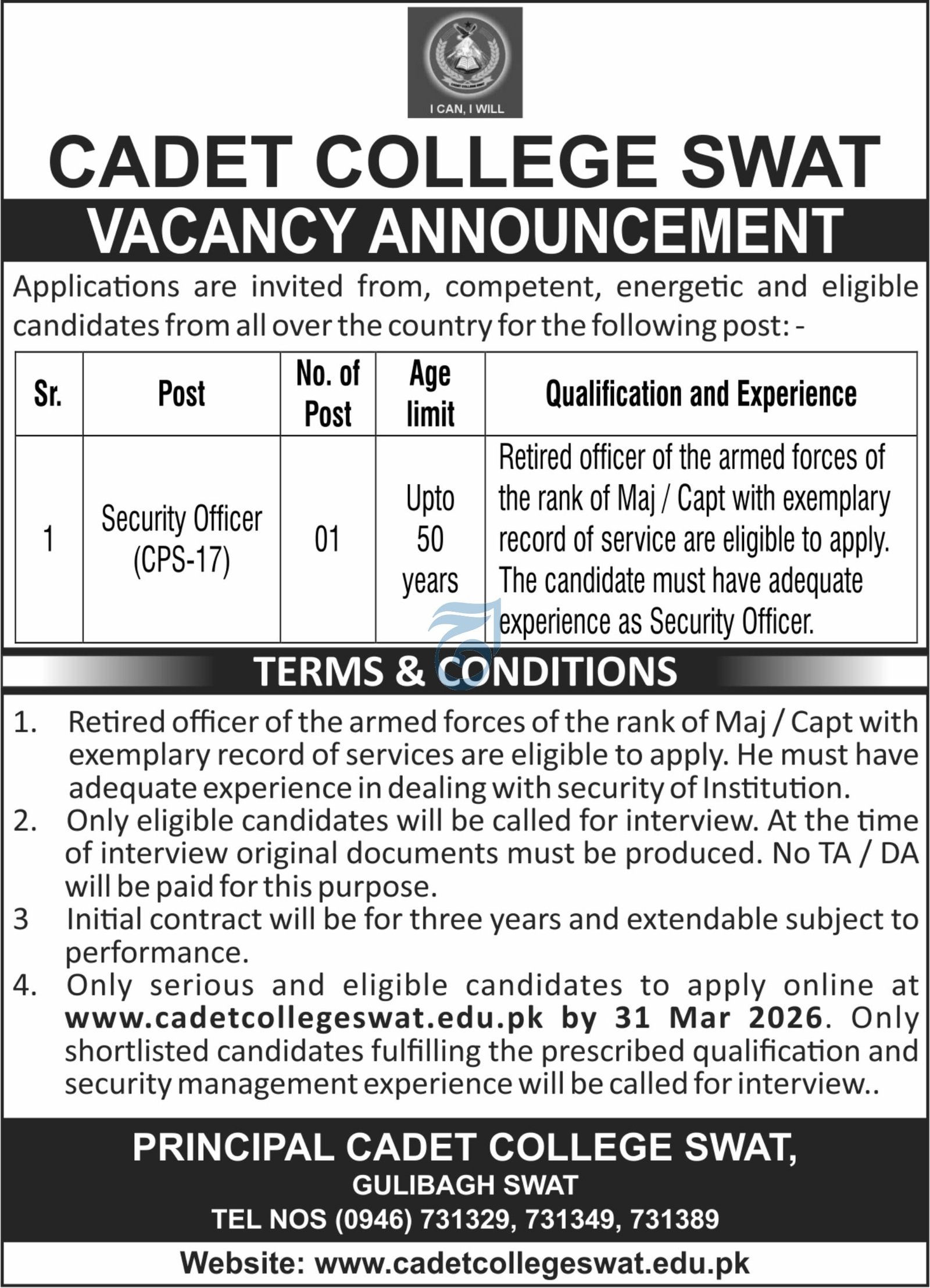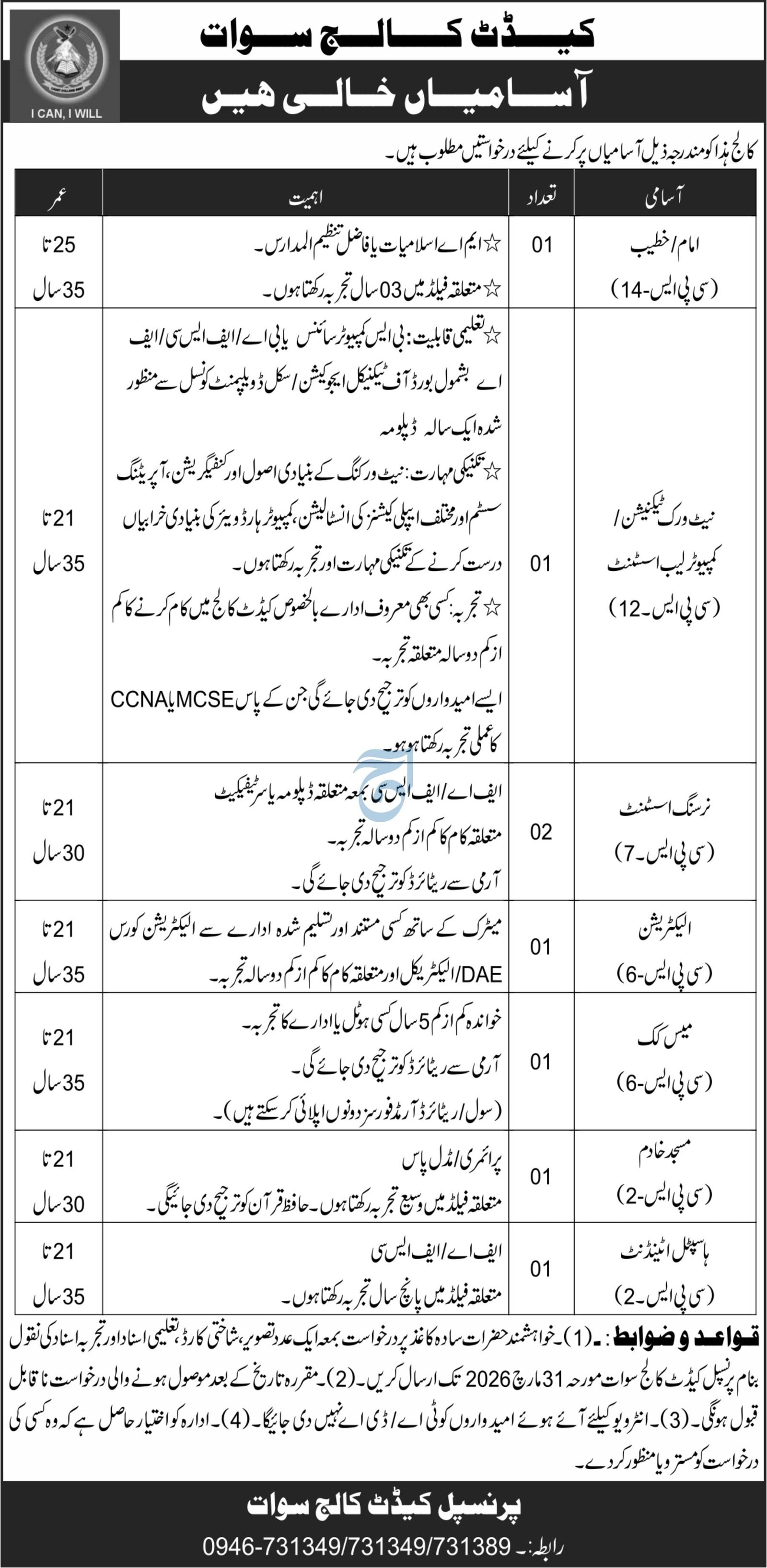 Cadet College Swat Khyber Pakhtunkhwa Jobs 2026 announce the Contract career opportunities for the post of See Below Ad in Khyber, Swat for the fresh and experienced candidates on Contract basis who have Check Advertisement degree. Posted date of this post is 20/03/2026 and the last date is 31/03/2026. if you are eligible for this job apply before due date.