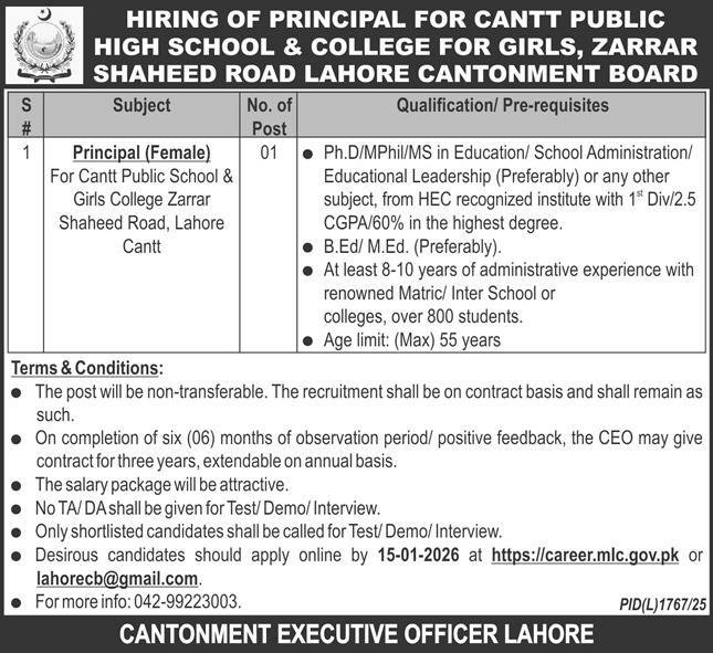 HIRING OF PRINCIPAL FOR CANTT PUBLIC HIGH SCHOOL & COLLEGE FOR GIRLS, ZARRAR SHAHEED ROAD LAHORE CANTONMENT BOARD