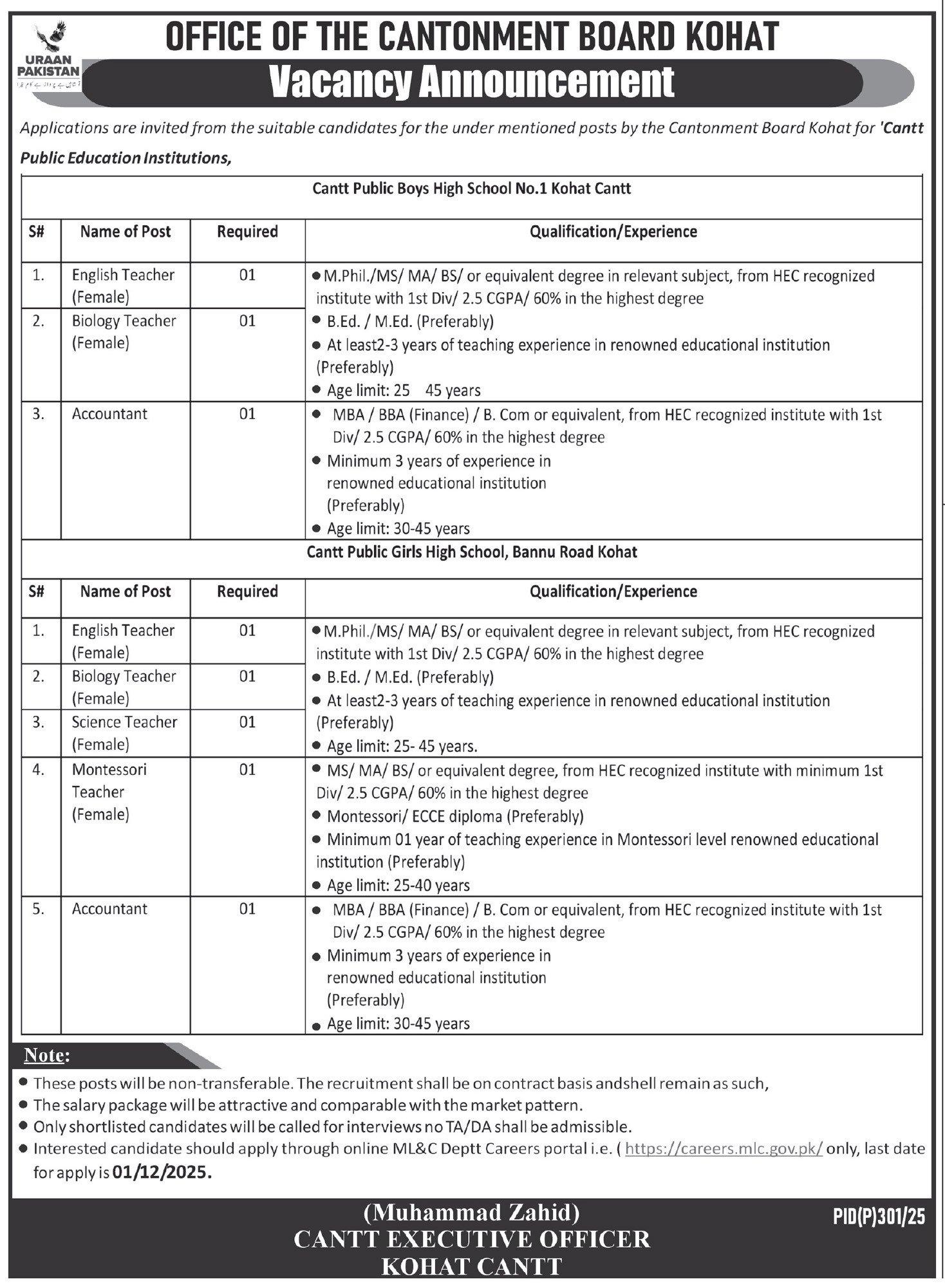 Cantt Public High School No 1 Kohat Cantt Jobs 2025 announce the Contract career opportunities for the post of See Below Ad in Khyber Pakhtunkhwa, Kohat for the fresh and experienced candidates on Contract basis who have Check Advertisement degree. Posted date of this post is 12/11/2025 and the last date is 01/12/2025. if you are eligible for this job apply before due date.