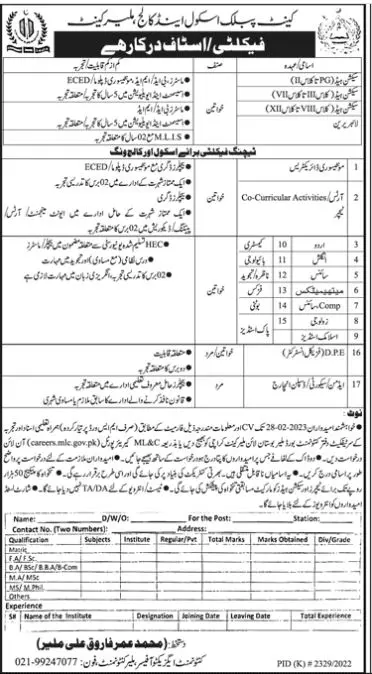 Cantt Public School and College Malir Cantt Jobs 2023 announce the Contract career opportunities for the post of See Below Ad in Sindh,Karachi for the fresh and experienced candidates on Contract basis who have Check Advertisement degree. Posted date of this post is 12/02/2023 and the last date is 28/02/2023. if you are eligible for this job apply before due date.