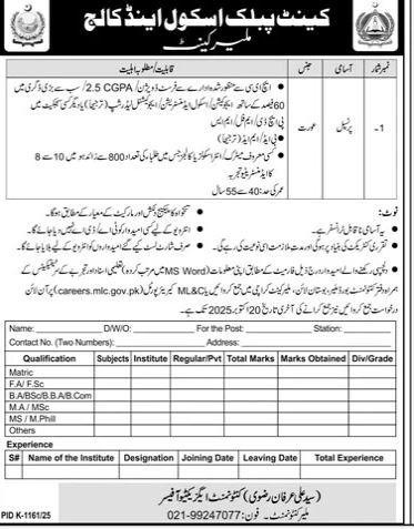 Cantt Public School And College Malir Cantt Jobs 2025 announce the Contract career opportunities for the post of See Below Ad in Sindh, Karachi for the fresh and experienced candidates on Contract basis who have Check Advertisement degree. Posted date of this post is 06/10/2025 and the last date is 20/10/2025. if you are eligible for this job apply before due date.