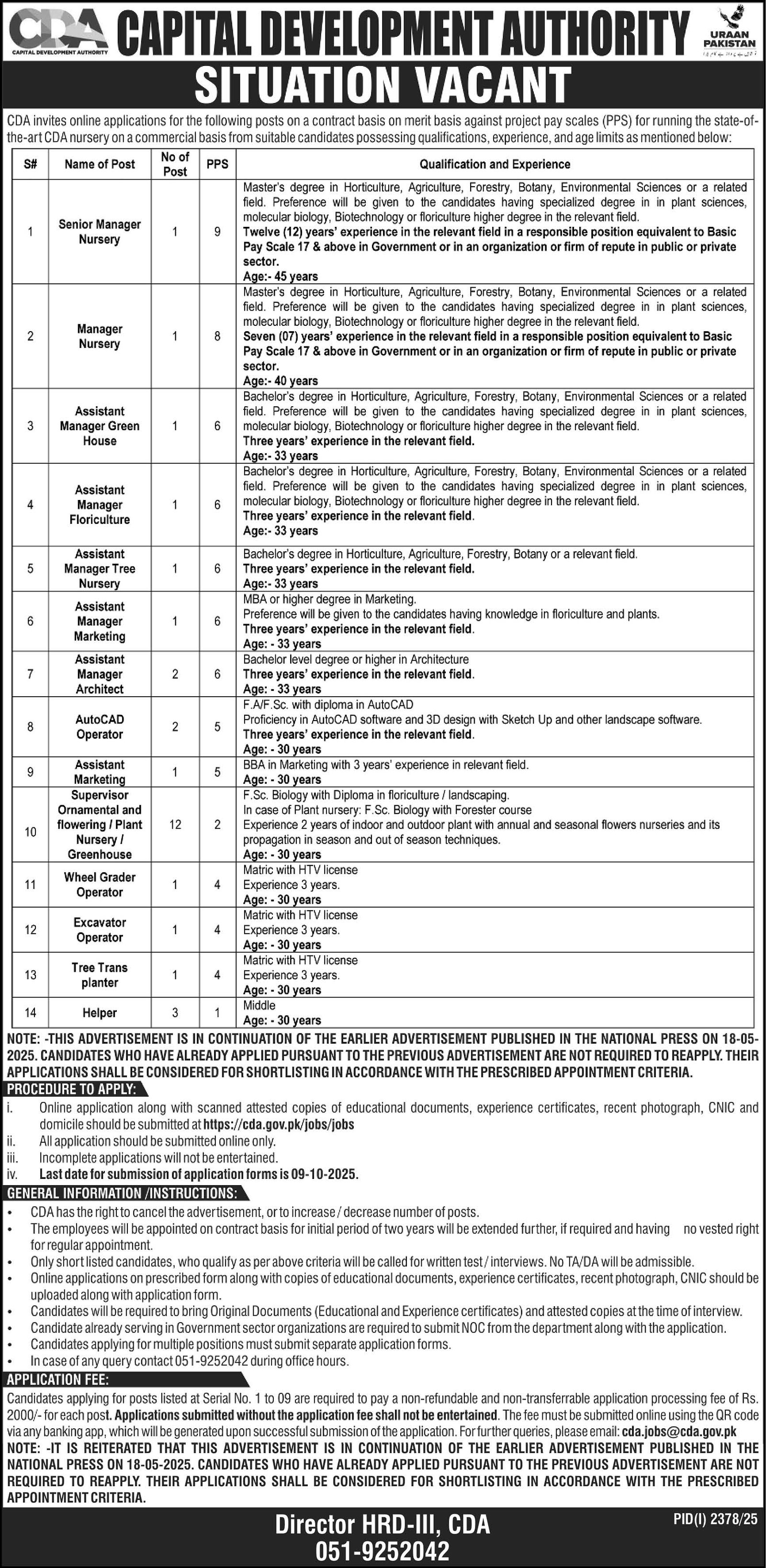 Capital Development Authority CDA Jobs 2025 announce the Contract career opportunities for the post of See Below Ad in Federal, Islamabad for the fresh and experienced candidates on Contract basis who have Check Advertisement degree. Posted date of this post is 20/09/2025 and the last date is 09/10/2025. if you are eligible for this job apply before due date.