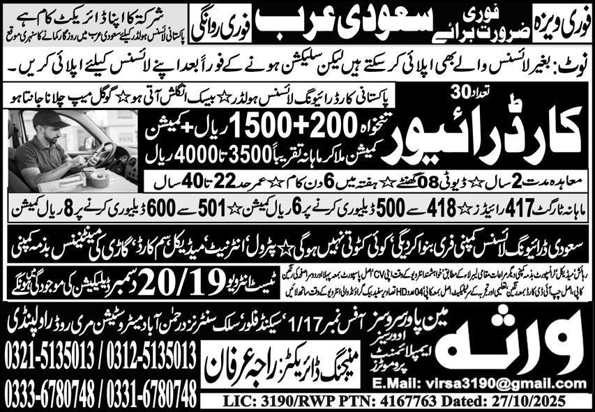 Car Driver Jobs in Saudia Arabia 2025 announce the Contract career opportunities for the post of See Below Ad in Saudi Arabia for the fresh and experienced candidates on Contract basis who have Check Advertisement degree. Posted date of this post is 17/12/2025 and the last date is 20/12/2025. if you are eligible for this job apply before due date.